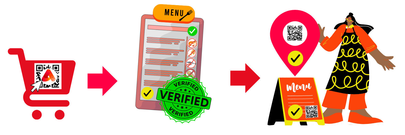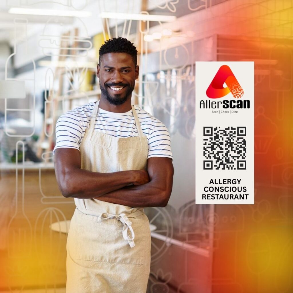 On registration, you receive a unique QR Code that links directly to your AllerSCAN listing. The QR Codes are supplied as table talkers, stickers, posters, and digitally to be shared across multiple platforms and scenarios, providing easy access to your unique allergy-conscious listing. Guests and potential customers can scan and browse your menu for available safe dining options and a breakdown of alternatives for  a safe dining experience.